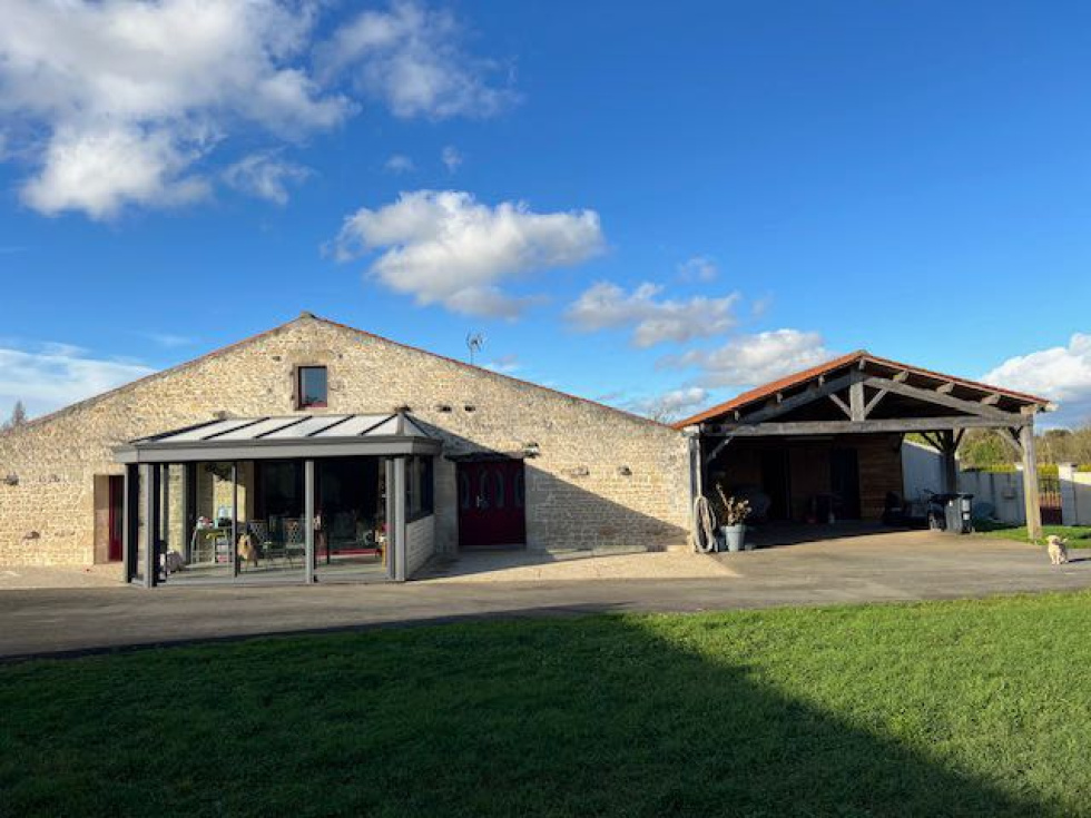 A 10 minutes DE ST JEAN D'HERMINE. Ref : 2127V. A proximité immédiate des écoles et commerces, et à seulement 5 minutes de Luçon, cette grange rénovée avec soin en 2009 offre de très beaux volumes et un cadre de vie agréable. Maison d'environ 159 m2 habitables avec vastes espaces de vie, un salon-séjour lumineux ouvert sur une cuisine entièrement équipée, ainsi qu'une véranda. l'espace nuit comprend une suite parentale avec salle d'eau, ainsi que 3 chambres supplémentaires desservies par une salle de bains. Un préau reli plusieurs espaces annexes : un bureau, un cellier, ainsi qu'un atelier pouvant être aménagé en chambre d'appoint ou espace indépendant selon vos besoins. L'ensemble est implanté sur un terrain clos de 1564 m2, cour bitumée, offrant de nombreuses possibilités de stationnement. Vous y trouverez également un hangar de 98 m2, espace de stockage ou pour un projet professionnel. Un bien rare, alliant charme, volumes et fonctionnalité, idéal pour une famille ou une activité nécessitant des dépendances. Prix de vente de 346 200€, honoraires de 16 200€ TTC inclus à la charge de l’acquéreur calculés sur le prix Net Vendeur de 330 000€. « Montant estimé des dépenses annuelles d'énergie pour un usage standard : entre 1340 € et 1880 € par an. Prix moyens des énergies indexés sur l'année 2021 2022 2023 (abonnements compris). » Consommation énergie primaire : 98 kWh/m²/an. Consommation énergie finale : 65kWh/m²/an. Les informations sur les risques auxquels ce bien est exposé sont disponibles sur le site Géorisques : www. georisques. gouv. fr.
